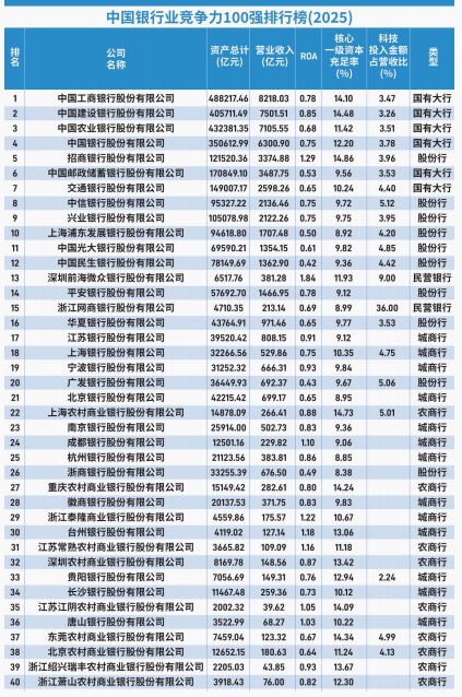 其中,“规模100强”聚焦总资产、总负债、贷款与存款等核心规模指标;“盈利100强”重点反映营业收入、净息差、ROA、ROE等盈利能力;而今年的“成长性100强”则在原有基础上引入营收增速、核心一级资本充足率、成本收入比以及科技投入及其占比等维度,力求从业务扩张、资本实力、运营效率与未来潜力等方面,更立体地呈现银行的发展动力。