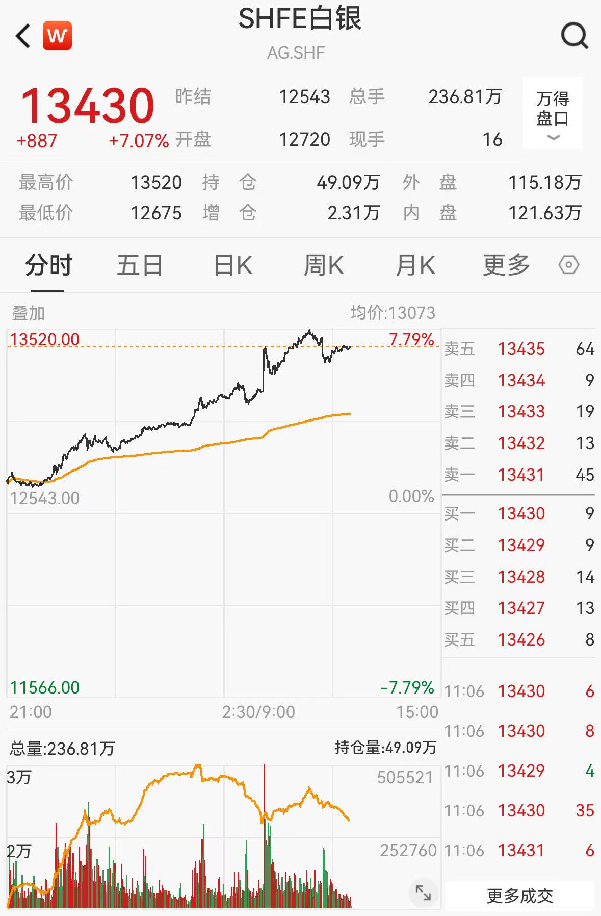 12月1日上午,白银期货主力合约开盘便跳空上涨超1.7%。 随后高开高走,日内一度涨超7%。截至11:06,白银期货主力合约报13430元/千克,涨7.07%,已经连续5个交易日飘红,累计上涨幅度超13%。上周五,纽交所COMEX白银期货创历史新高,今天继续创新高。
