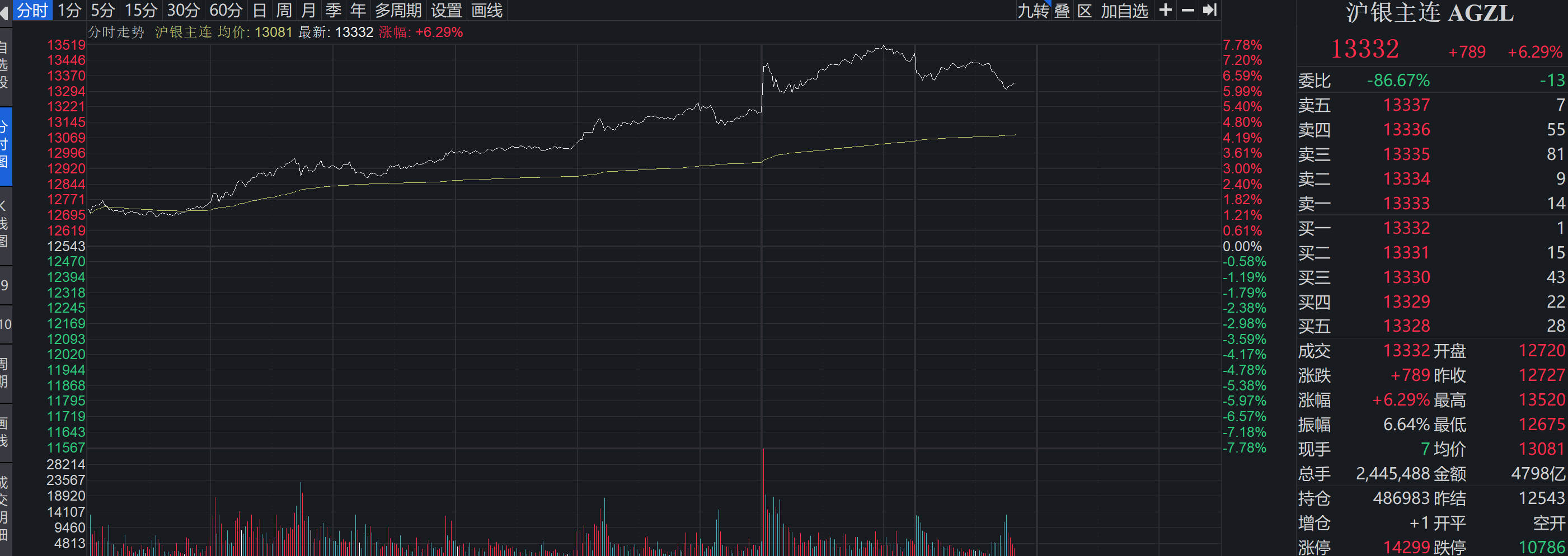 上海期货交易所的白银主力合约价格涨至13520元/公斤,涨幅超过7%,月线上已经连续上涨8个月。