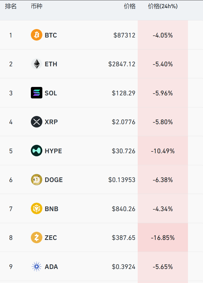 截至9:30,比特币跌至87000美元关口,日内跌超4%。以太坊跌至2800美元左右,跌幅超5%。