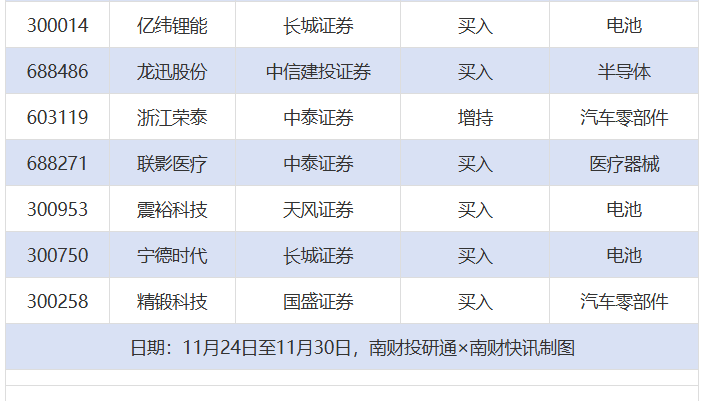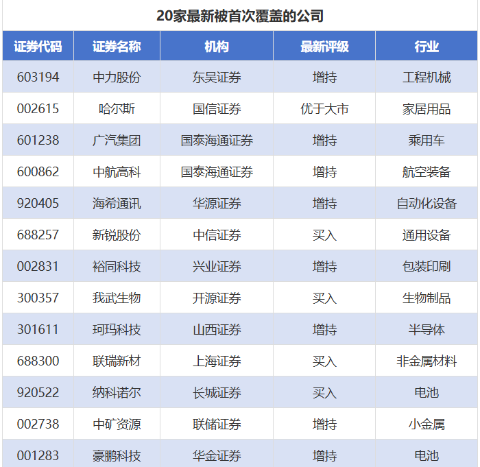 首次覆盖方面,11月24日至11月30日券商共给出了53次首次覆盖,其中中力股份获得东吴证券给予“增持”评级,哈尔斯获得国信证券给予“优于大市”评级,广汽集团、中航高科获得国泰海通证券给予“增持”评级,海希通讯获得华源证券给予“增持”评级。