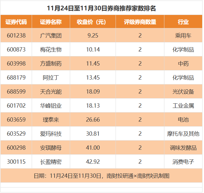 从券商推荐家数来看,11月24日至11月30日有238家上市公司得到券商推荐,其中广汽集团、梅花生物、方盛制药等获得2家券商推荐。