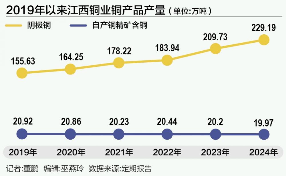 2023年、2024年,江西铜业自产铜精矿含铜分别达到20.2万吨、19.97万吨。以上矿产铜,全部来自于公司在产的德兴铜矿、永平铜矿等五大自有矿山。