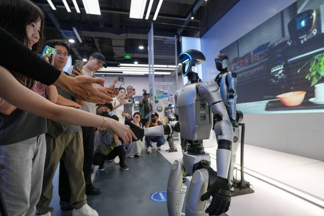 在位于北京的全球首个具身智能机器人4S店内,观众在与一款人形机器人握手。来源:新华社