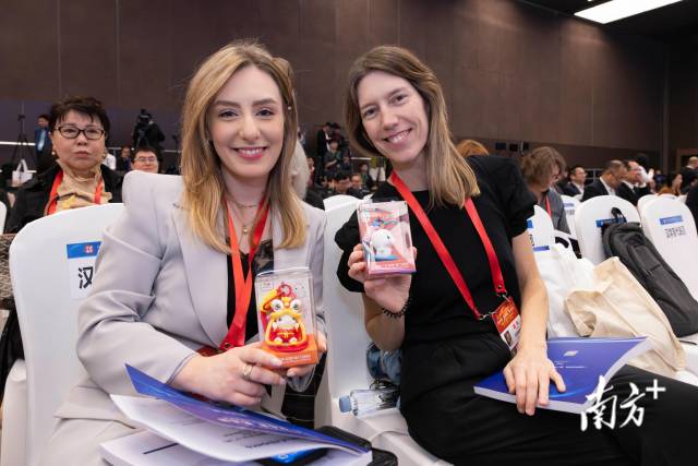 外宾在2025年“读懂中国”国际会议开幕式上展示礼包中的十五运会吉祥物。南方+记者梁钜聪 摄