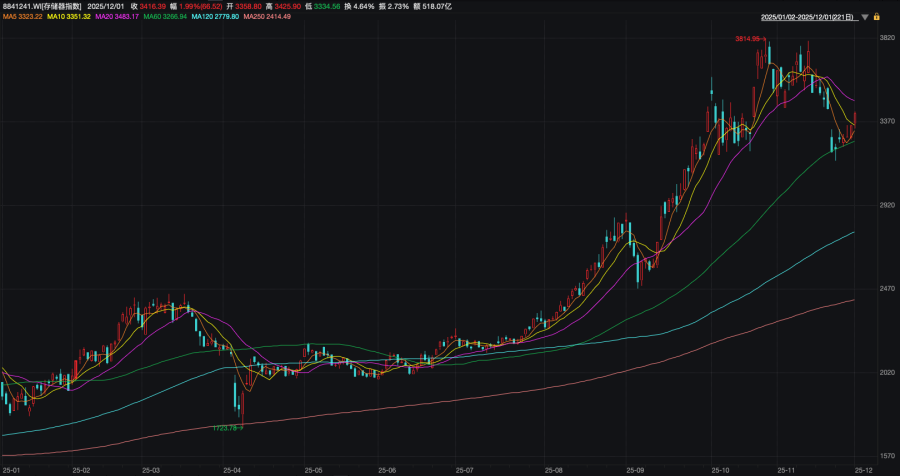 存储器市场在11月中下旬突遇“寒潮”,作为AI浪潮下的受益板块之一,存储器概念此前的上涨态势随着AI泡沫论等担忧受到剧烈影响,11月底的板块骤降反映出市场的敏感性。