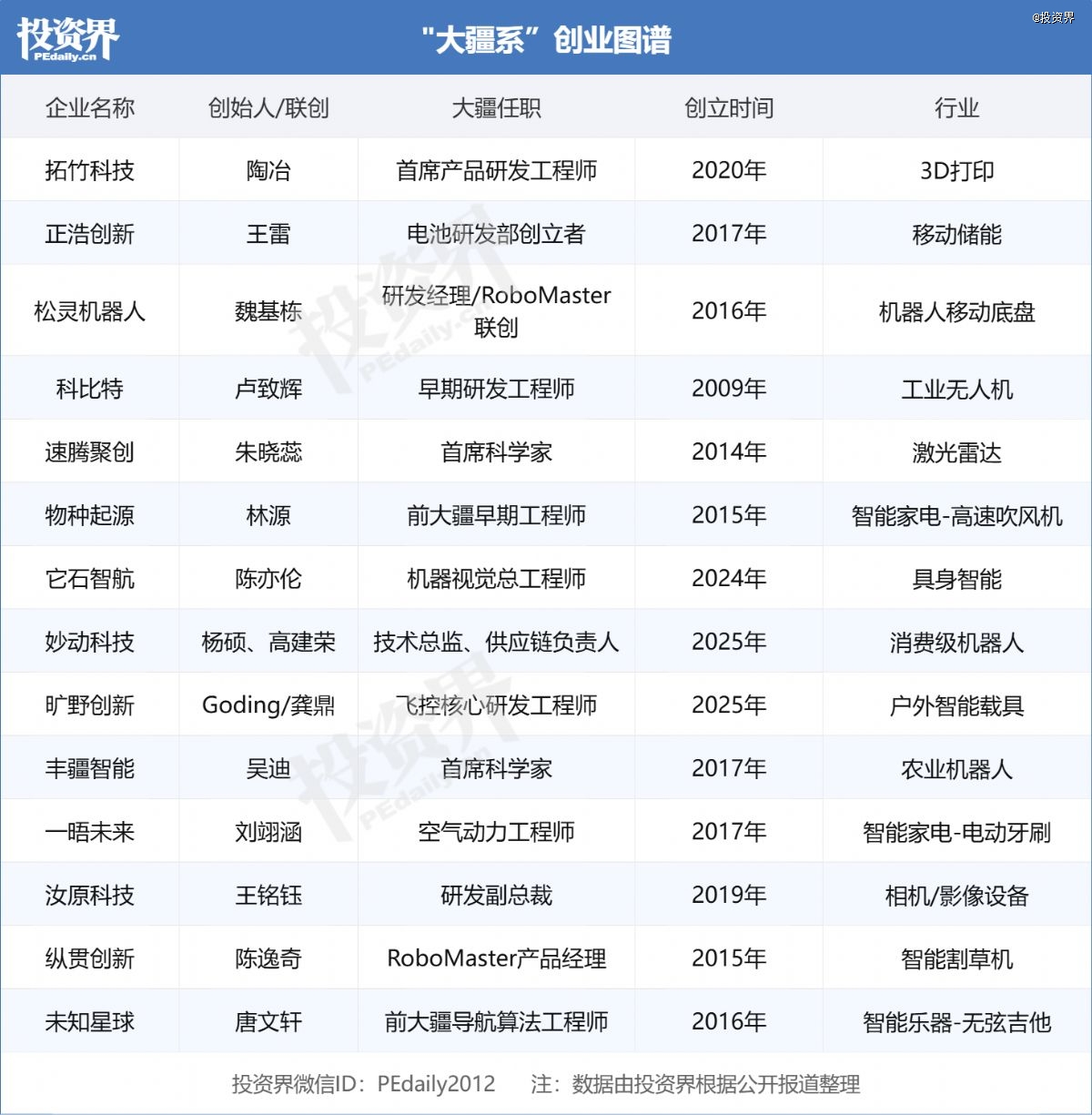 比陶冶早几年,王雷在2017年离开一手建立的大疆电池研发部,成立移动储能公司正浩创新;早王雷一年,大疆高管魏基栋决定去做机器人,松灵机器人成立,今年拿下红杉中国、五源资本、祥峰投资和HKX的亿元融资。更有今年刚成立就拿下红杉中国、经纬创投、美团龙珠融资的妙动科技……这是一串长到让人惊讶的名单——