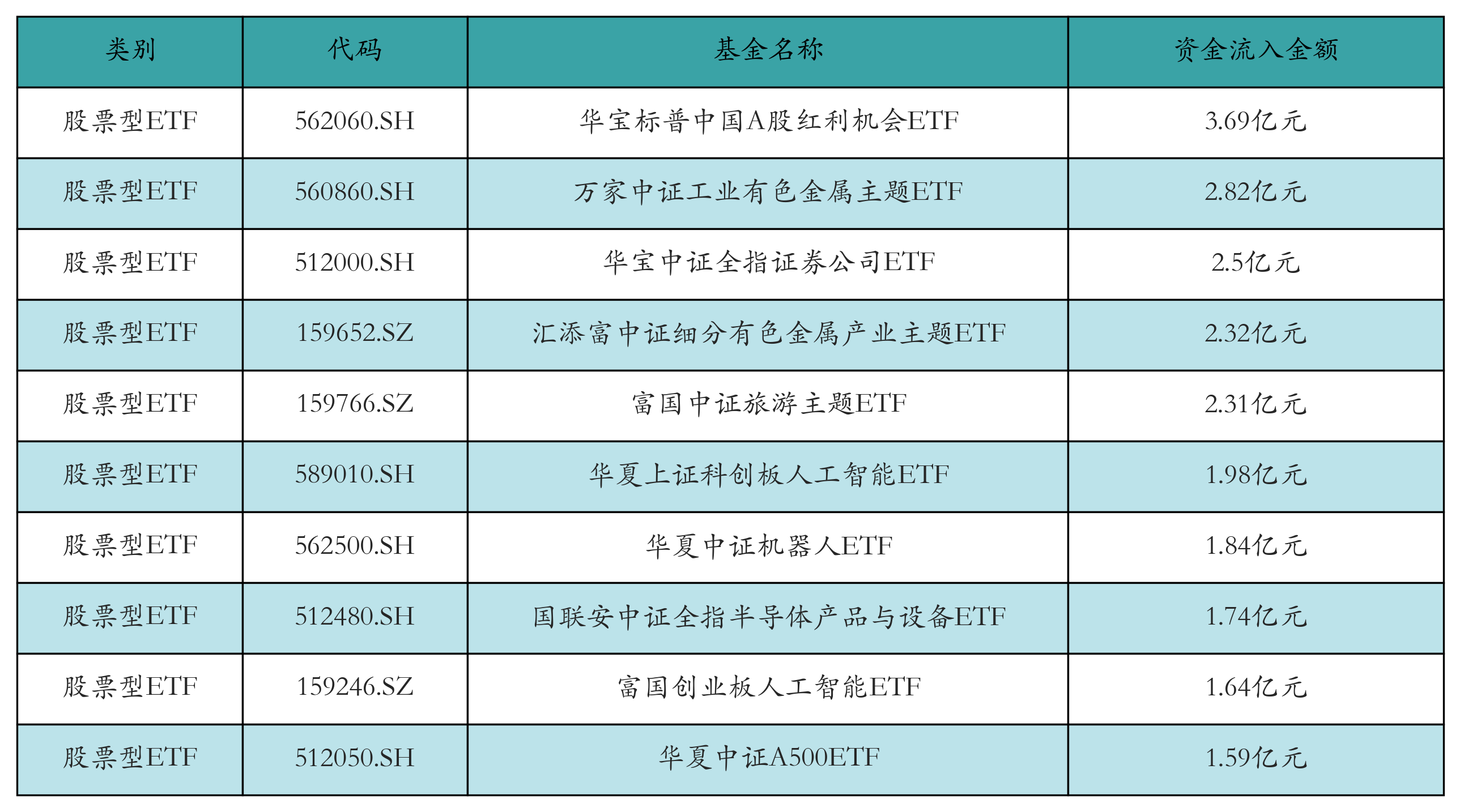昨日股票型ETF资金流入最多的3只ETF及其流入金额分别为:华宝标普中国A股红利机会ETF(流入3.69亿元)、万家中证工业有色金属主题ETF(流入2.82亿元)、华宝中证全指证券公司ETF(流入2.5亿元)。资金流入前10详情见下表: