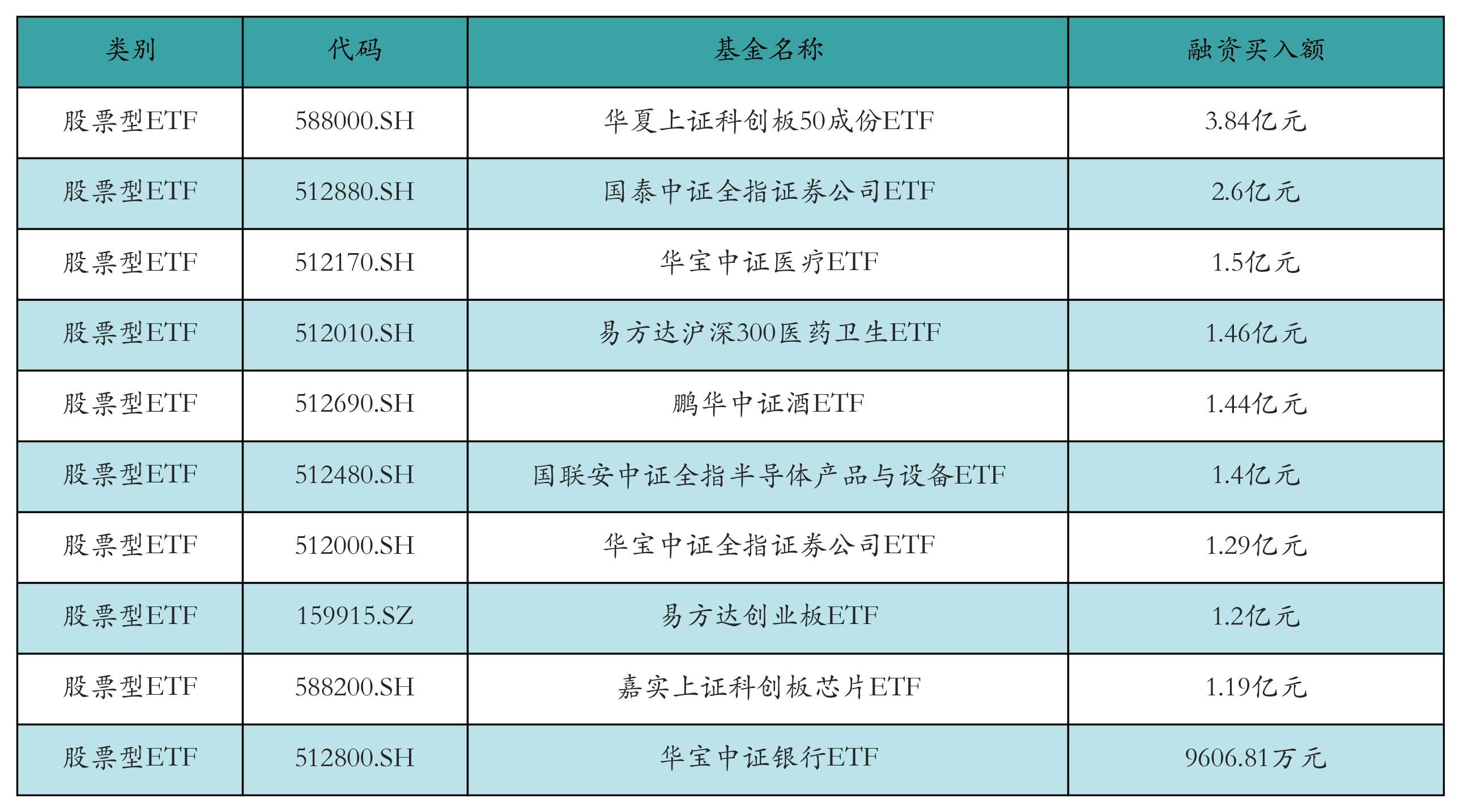 昨日股票型ETF融资买入额最高的3只ETF及其买入金额分别为:华夏上证科创板50成份ETF(3.84亿元)、国泰中证全指证券公司ETF(2.6亿元)、华宝中证医疗ETF(1.5亿元)。融资买入额前10详情见下表: