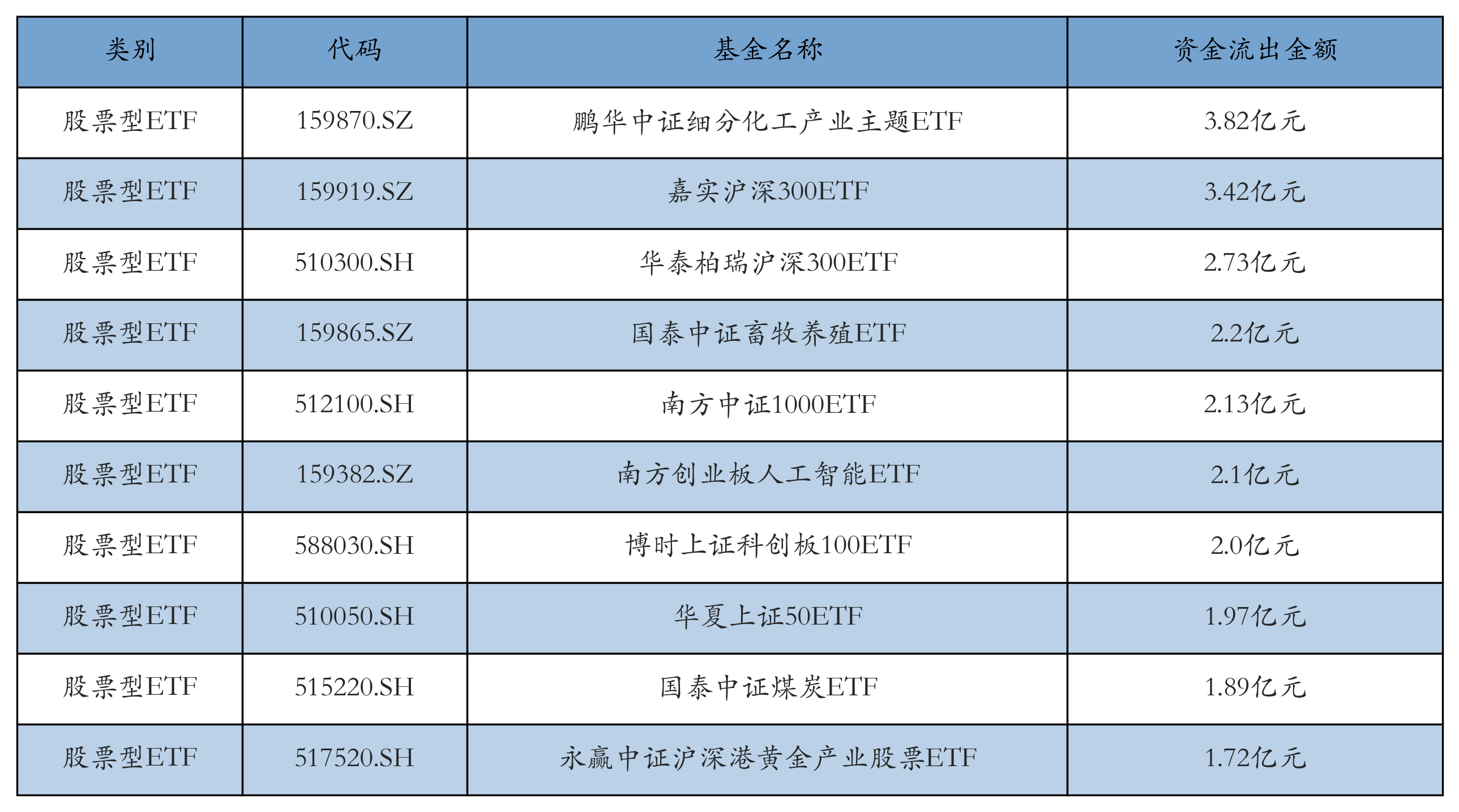 昨日股票型ETF资金流出最多的3只ETF及其流出金额分别为:鹏华中证细分化工产业主题ETF(流出3.82亿元)、嘉实沪深300ETF(流出3.42亿元)、华泰柏瑞沪深300ETF(流出2.73亿元)。资金流出前10详情见下表: