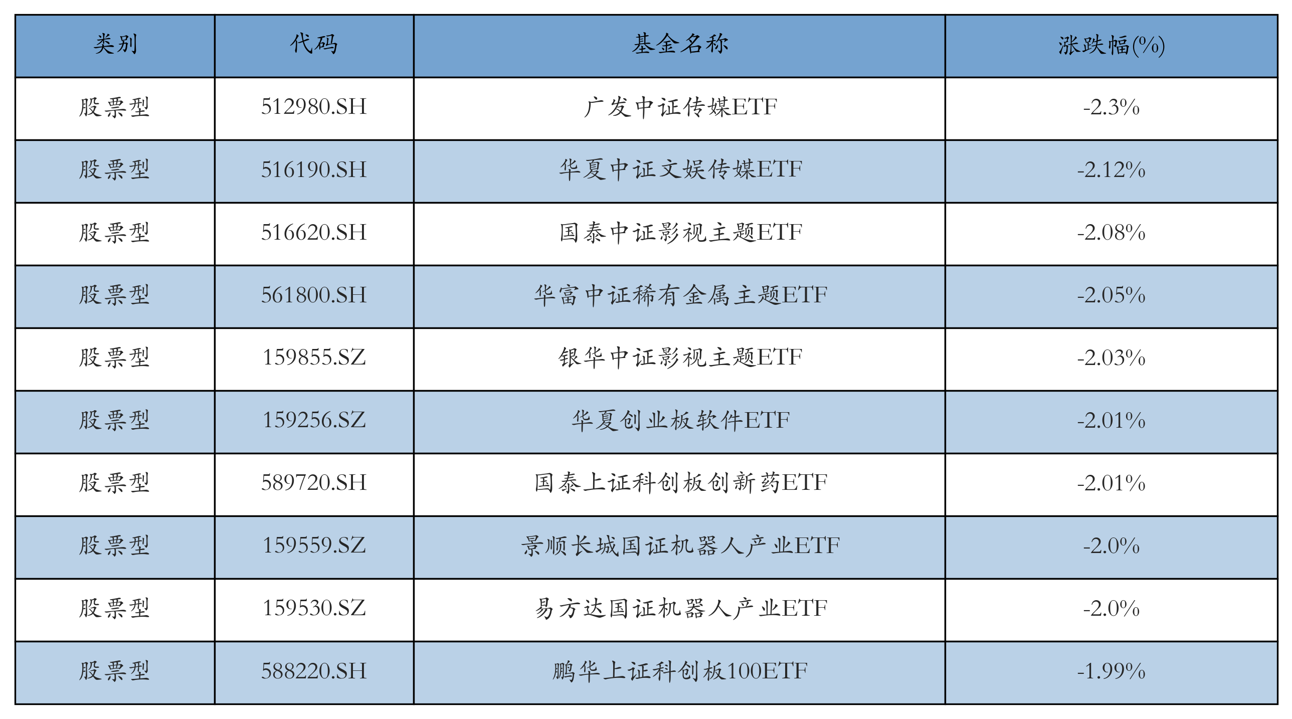 昨日股票型ETF跌幅最大的3只ETF及其收益率分别为:广发中证传媒ETF(-2.3%)、华夏中证文娱传媒ETF(-2.12%)、国泰中证影视主题ETF(-2.08%)。跌幅前10详情见下表: