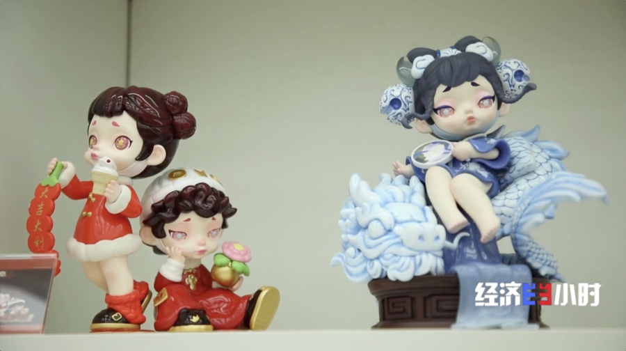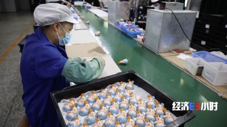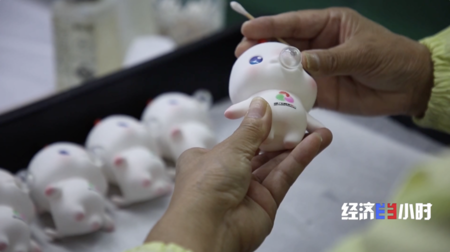 广东东莞石排镇是潮流玩具产业聚集区,小镇里坐落着一家工艺品制造企业的生产车间。记者采访时正值全运会期间,车间里的工人正加班加点生产全运会吉祥物的特许商品。六年前他们以代工为主,后来慢慢创建自己的设计团队,有自己的IP设计,生产渠道,整个产业链。