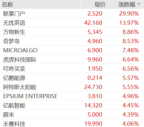 中概股涨跌不一,纳斯达克中国金龙指数涨近0.4%。计算机硬件股万物新生涨近9%,阿特斯太阳能涨超5%,蔚来、亿航智能、禾赛科技涨超4%,小鹏汽车涨超3%,百度、哔哩哔哩涨超1%;大全新能源跌近3%,BOSS直聘跌超2%,百胜中国、名创优品、奇富科技跌逾1%。