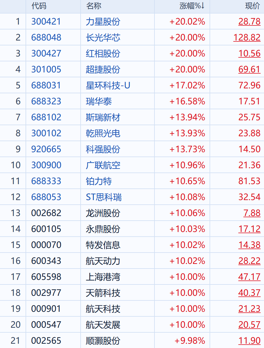 蓝箭航天朱雀三号火箭成功发射后,二级市场也对商业航天板块反响热烈。12月5日,商业航天概念板块全面爆发,单日涨停企业超20家。其中,顺灏股份实现“六天五板”,龙洲股份收获“三连板”,力星股份、红相股份、超捷股份、斯瑞新材等涨幅居前。