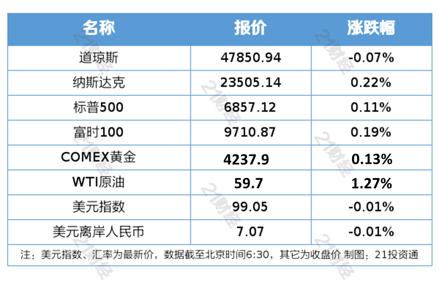 1、美国三大股指收盘涨跌不一,道指跌0.07%报47850.94点,标普500指数涨0.11%报6857.12点,纳指涨0.22%报23505.14点。3M公司跌超2%,联合健康集团跌近2%,领跌道指。万得美国科技七巨头指数涨0.4%,脸书涨超3%,英伟达涨逾2%。中概股涨跌不一,万物新生涨近9%,大全新能源跌近3%。在美联储下周召开货币政策会议之前,市场情绪谨慎。