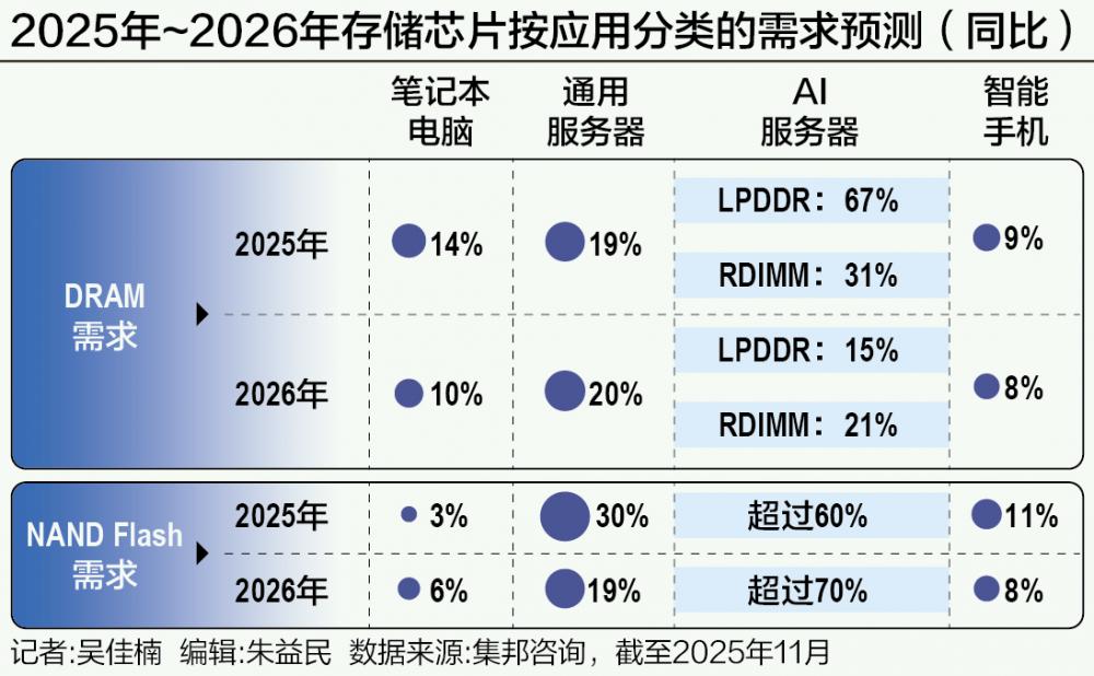 集邦咨询数据显示,2026年,通用服务器对于DRAM需求将同比增长20%,对于NAND Flash的需求将同比增长19%;AI服务器对于DRAM需求方面,预计2026年LPDDR需求同比增长15%,RDIMM同比增长21%,对于NAND Flash需求将继续大涨超70%。