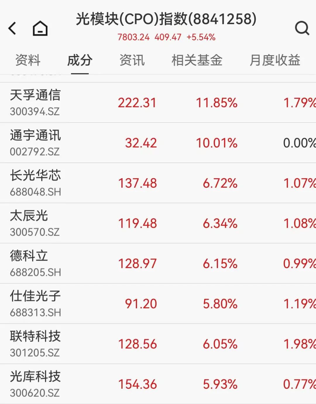 CPO板块持续拉升,中际旭创股价一度创历史新高,报559.88元。天孚通信涨超11%,通宇通讯、中瓷电子涨停,泰晶科技、腾景科技跟涨。