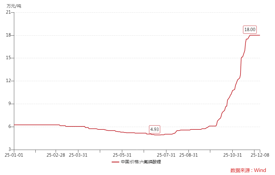 相关数据显示,今年9月末,六氟磷酸锂价格保持在6.1万元/吨,至12月8日已经升至18万元/吨,四季度以来涨幅达到195%。