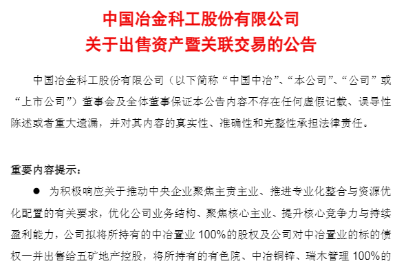 中国中冶公告称,通过本次交易,公司将剥离非核心资产并优化配置资源,有利于优化公司业务结构、聚焦核心主业、提升核心竞争力与持续盈利能力。未来,公司将聚焦冶金工程、有色与矿山工程建设和运营、高端基建、工业建筑和新兴产业等领域。