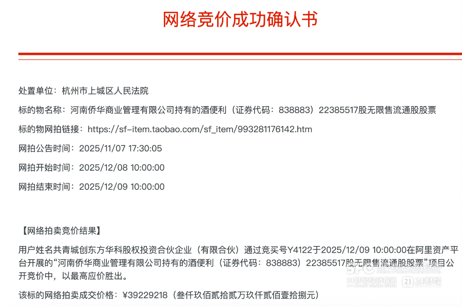 12月8日-9日,阿里司法拍卖平台公开拍卖了河南侨华商业管理有限公司(下称河南侨华)所持酒便利约51%股份。