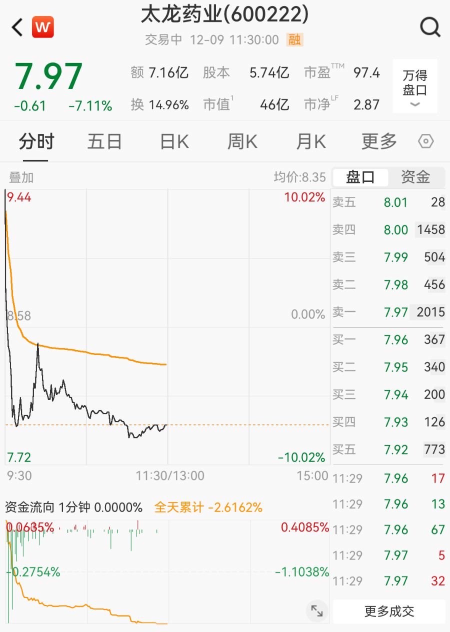 12月9日,太龙药业(600222.SH)复牌后涨停开盘,随后急速下杀翻绿,10分钟内跌超15%,维持低位震荡走势。截至午间收盘,报7.97元/股,跌7.11%。