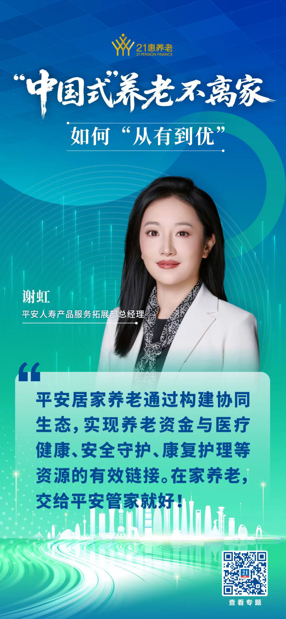 近期,平安还进一步升级了居家养老服务体系:一是打造长寿-慢病-疾病全流程的医健服务,二是完善居家环境风险评估-预防-监测-响应的安全守护体系,三是升级失能失智等3大照护场景及全周期整合照护专案。
