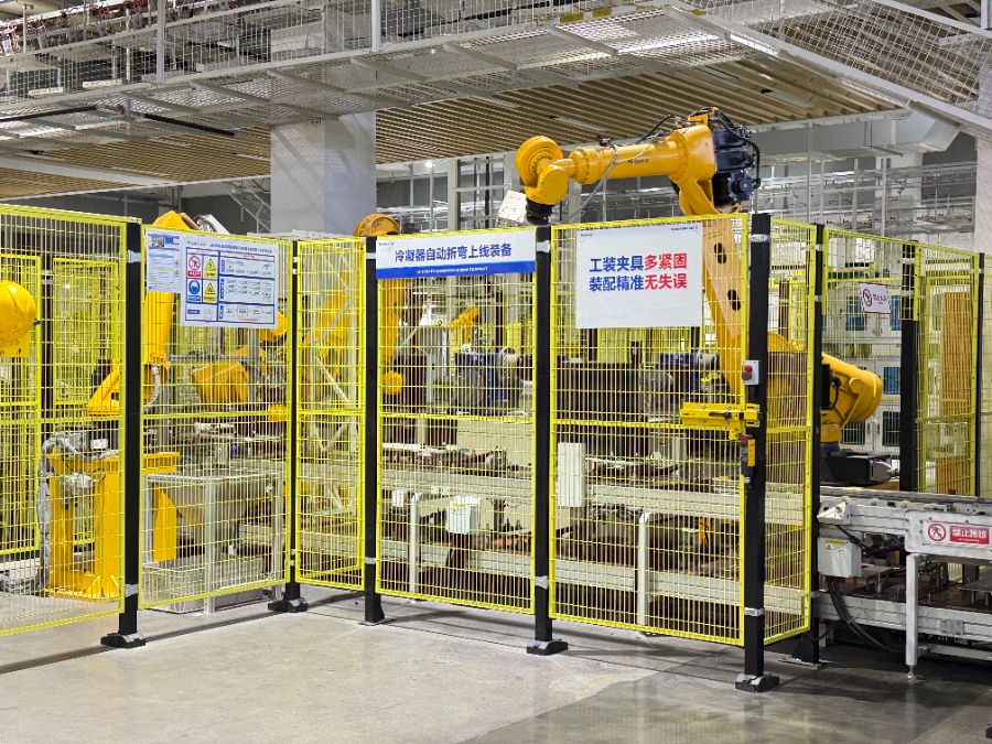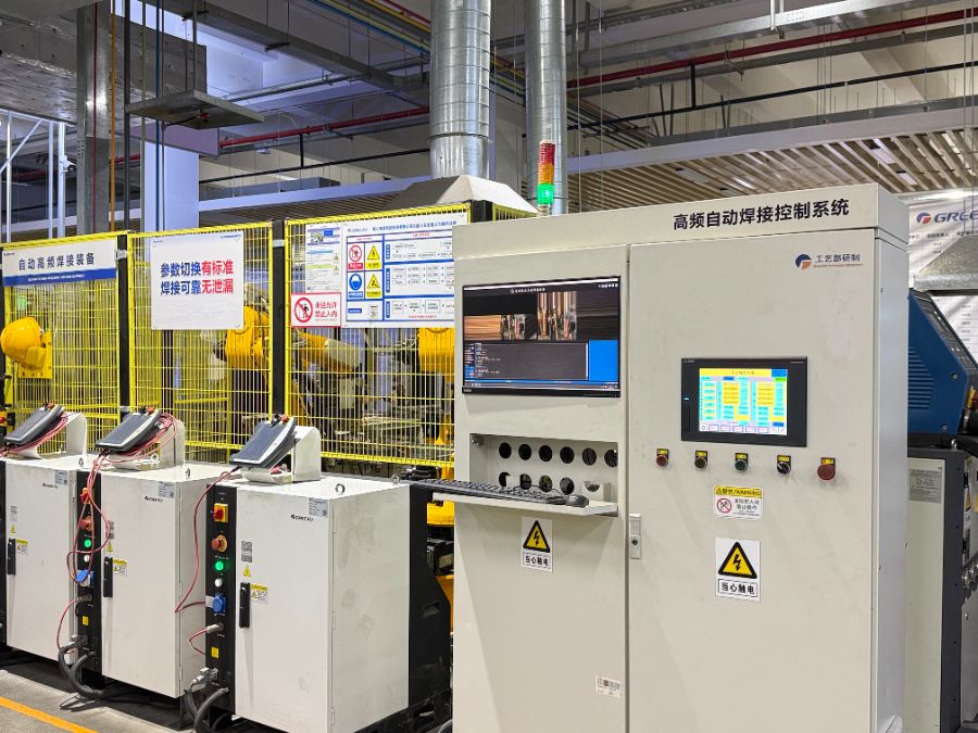 总装集成智造车间内,480米长的外机生产线,103个工序中86个已实现自动化,传统需70多人的产线现仅需约20人。关键工序如氦检、焊接、抽空灌注、商检测试、激光打标、外观检测、套袋包装等均已实现无人化作业。通过MES条码、RFID、视觉识别等技术,实现了生产数据实时采集、质量全程可追溯与物料智能配送。成品入库环节亦通过无人叉车与智能算法实现全自动化仓储。