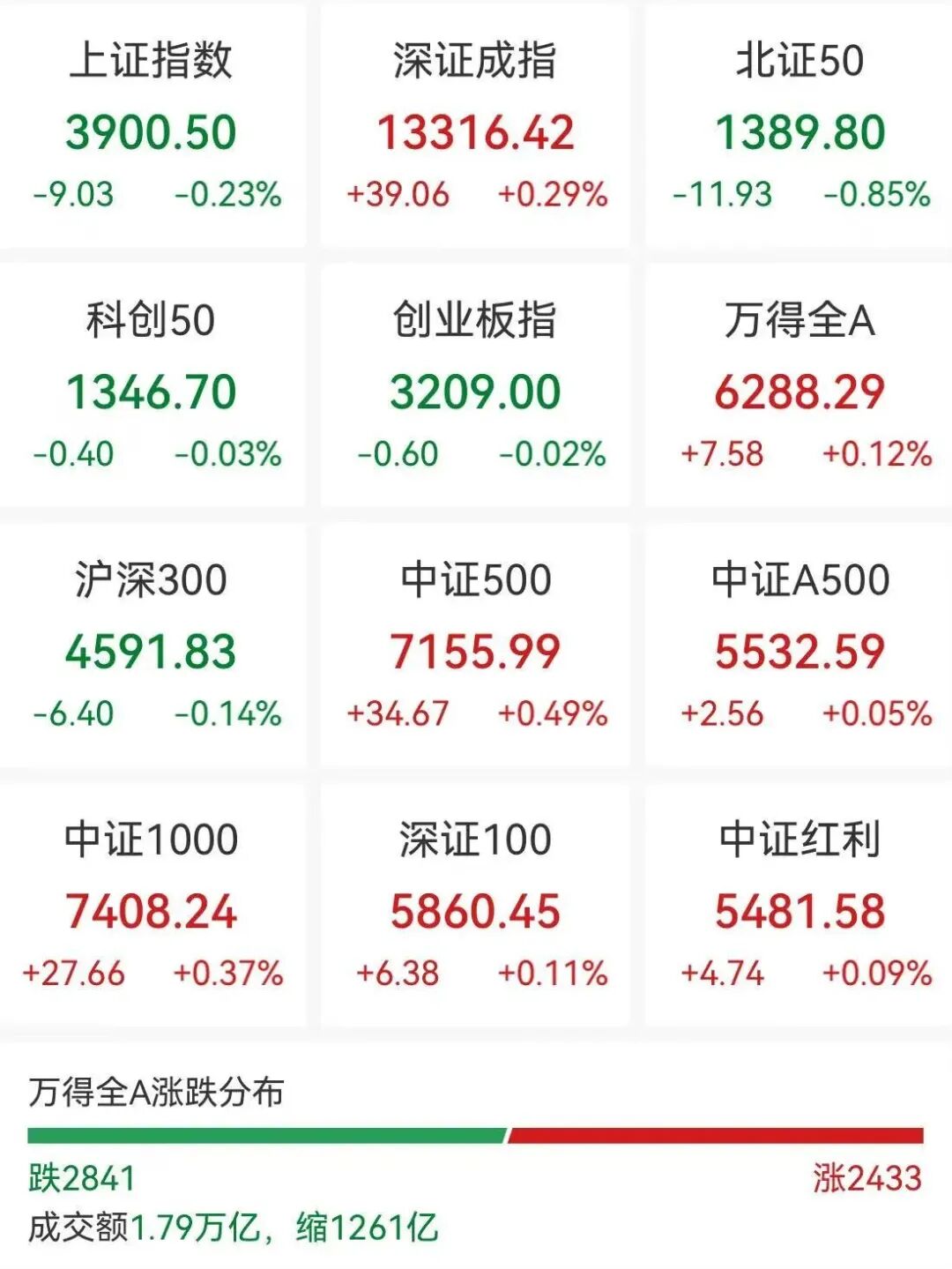 12月10日,A股三大指数涨跌不一,截至收盘,沪指跌0.23%,深成指涨0.29%,创业板指跌0.02%。全市场成交额1.79万亿元,较上一个交易日缩量1261亿元,超2800只个股下跌。