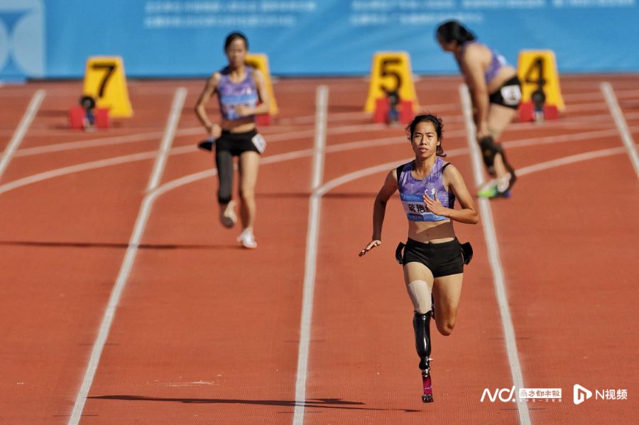 女子100米T64级决赛,广东一团运动员蒋艳红(中)以14.99秒成绩夺冠。