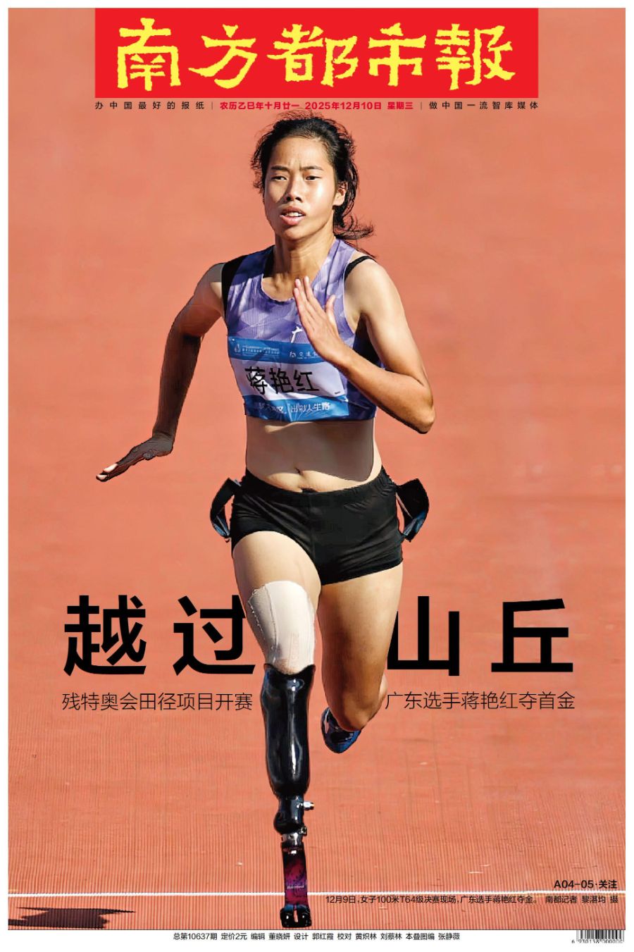 12月9日,残特奥会田径项目在广东省奥体中心体育场开赛,在率先进行的女子100米T64级决赛中,广东一团运动员蒋艳红以14.99秒的成绩夺冠,为广东田径队赢得开门红,这是本届残特奥会田径比赛的首金。