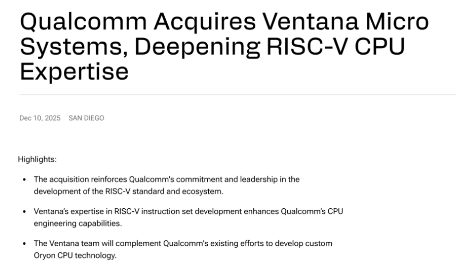 高通科技公司宣布收购Ventana Micro Systems Inc.,凸显其推动RISC-V标准和生态系统发展的承诺。据称,通过整合Ventana在RISC-V ISA开发方面的专业知识,将增强高通的CPU能力。Ventana团队将补充高通正在进行的RISC-V和定制Oryon CPU开发。“我们相信RISC-V指令集架构有潜力推动CPU技术前沿的发展。收购Ventana Micro Systems标志着我们交付行业领先的基于RISC-V的CPU技术跨产品旅程中的关键一步,“高通执行副总裁兼技术规划、边缘解决方案及数据中心总经理Durga Malladi表示。