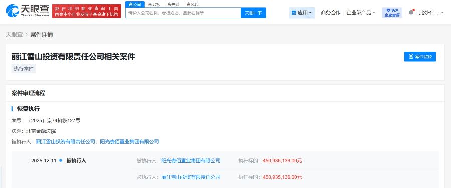 天眼查天眼风险信息显示,12月11日,丽江雪山投资有限责任公司、阳光壹佰置业集团有限公司新增一则恢复执行信息,执行标的4.5亿余元,执行法院为北京金融法院。