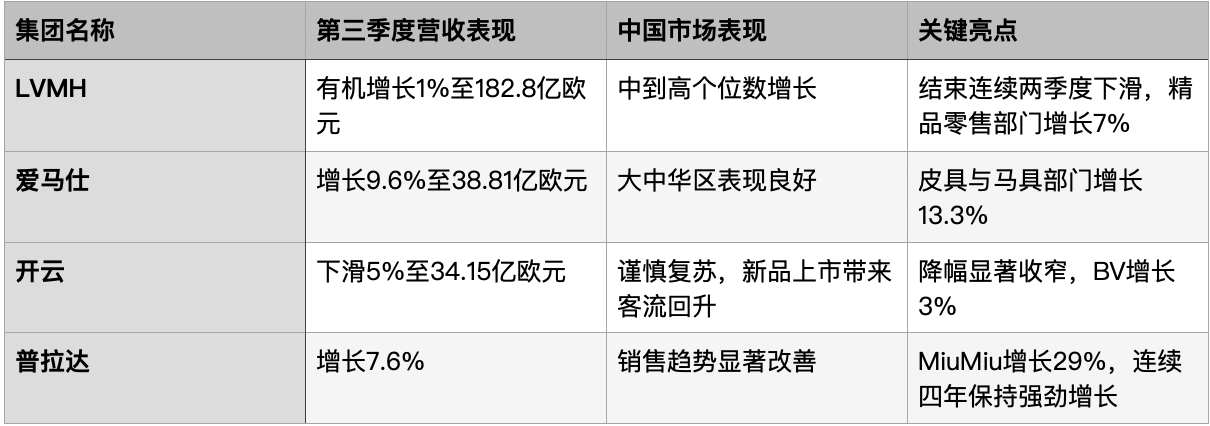其他集团的业绩则勾勒出市场分化的现状。爱马仕凭借品牌力与客户忠诚度,第三季度营收增长9.6%,表现稳健。普拉达集团前三季度营收增长8%,其首席执行官安德烈·圭拉表示,中国市场销售趋势在第三季度得到了“显著改善”。