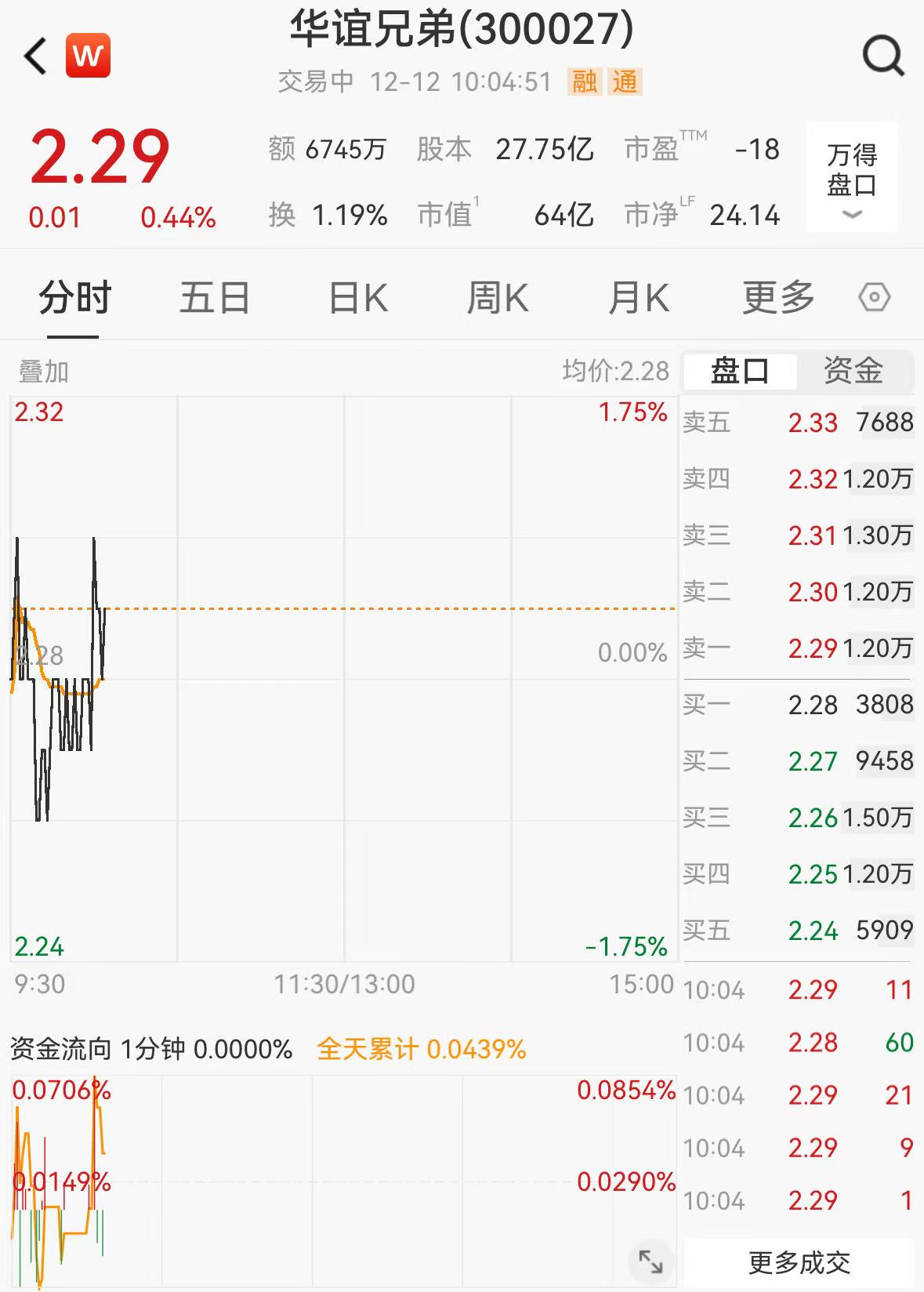 截至10:04,华谊兄弟A股股价报2.29元/股,涨0.44%,总市值为64亿元,今年以来华谊兄弟股价已跌超12%。