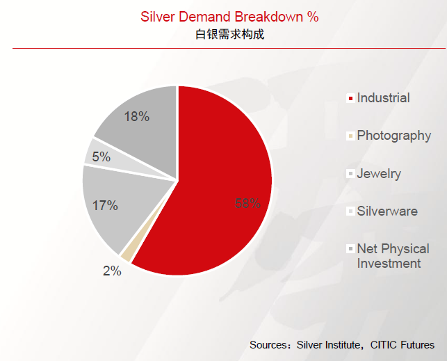 中信期货研报指出,白银的需求主要由工业用银、投资用银、摄影用银以及首饰用银组成。