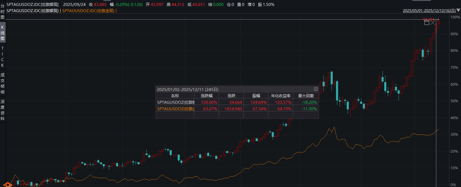 美联储如期降息,近期白银市场迎来的历史性行情,12月12日,据Wind数据显示,沪银期货主力合约涨超3%,盘中价格续创历史新高。伦敦银现盘中价格突破64美元/盎司,创历史新高。拉长时间看,今年以来(截至12月11日)伦敦银现已涨120%,远高于同期伦敦金现的涨幅(63%)。