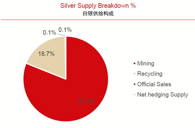 据中信期货,白银的供给主要分为矿产、回收利用、官方销售。