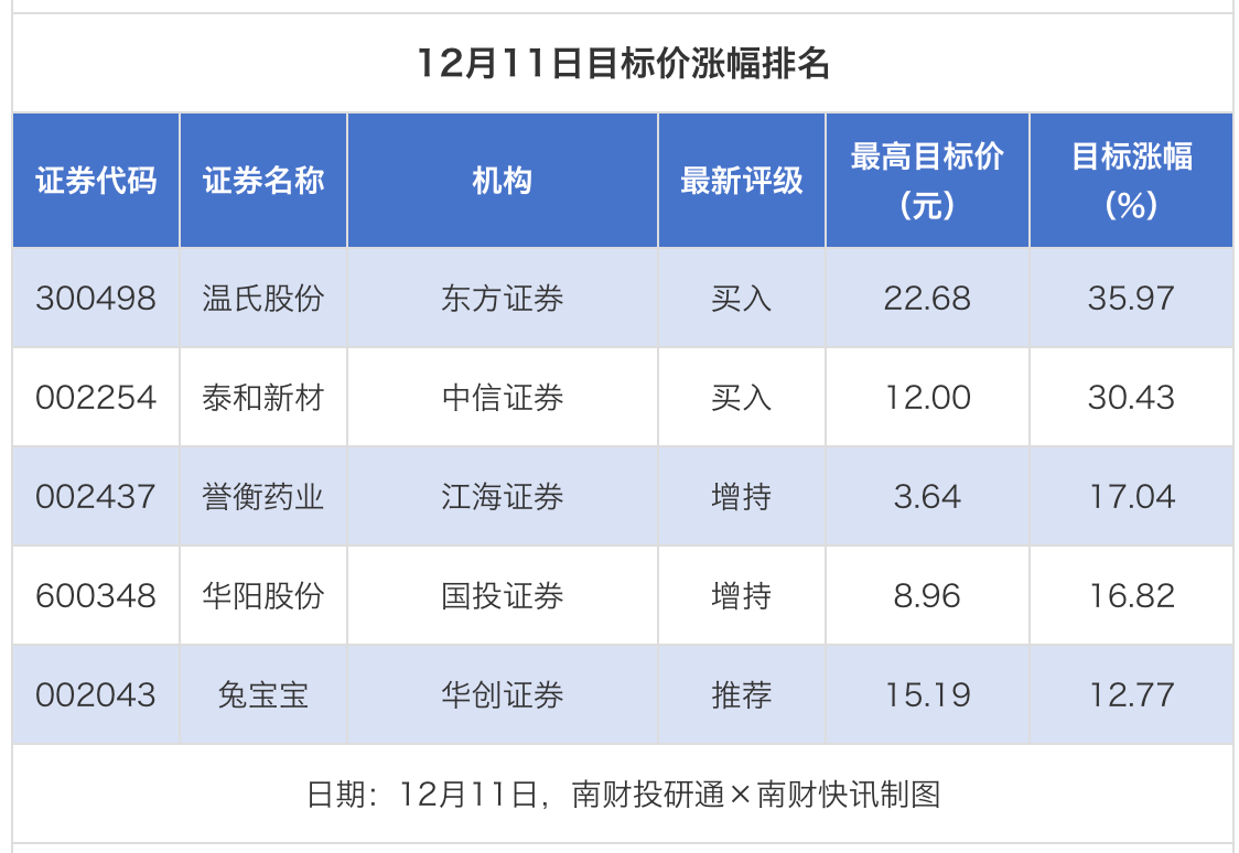 南财投研通数据显示,12月11日,券商给予上市公司目标价共5次,按最新收盘价计算,目标价涨幅排名居前的公司有温氏股份、泰和新材、誉衡药业,目标价涨幅分别为35.97%、30.43%、17.04%,分别属于养殖业、化学纤维、化学制药行业。