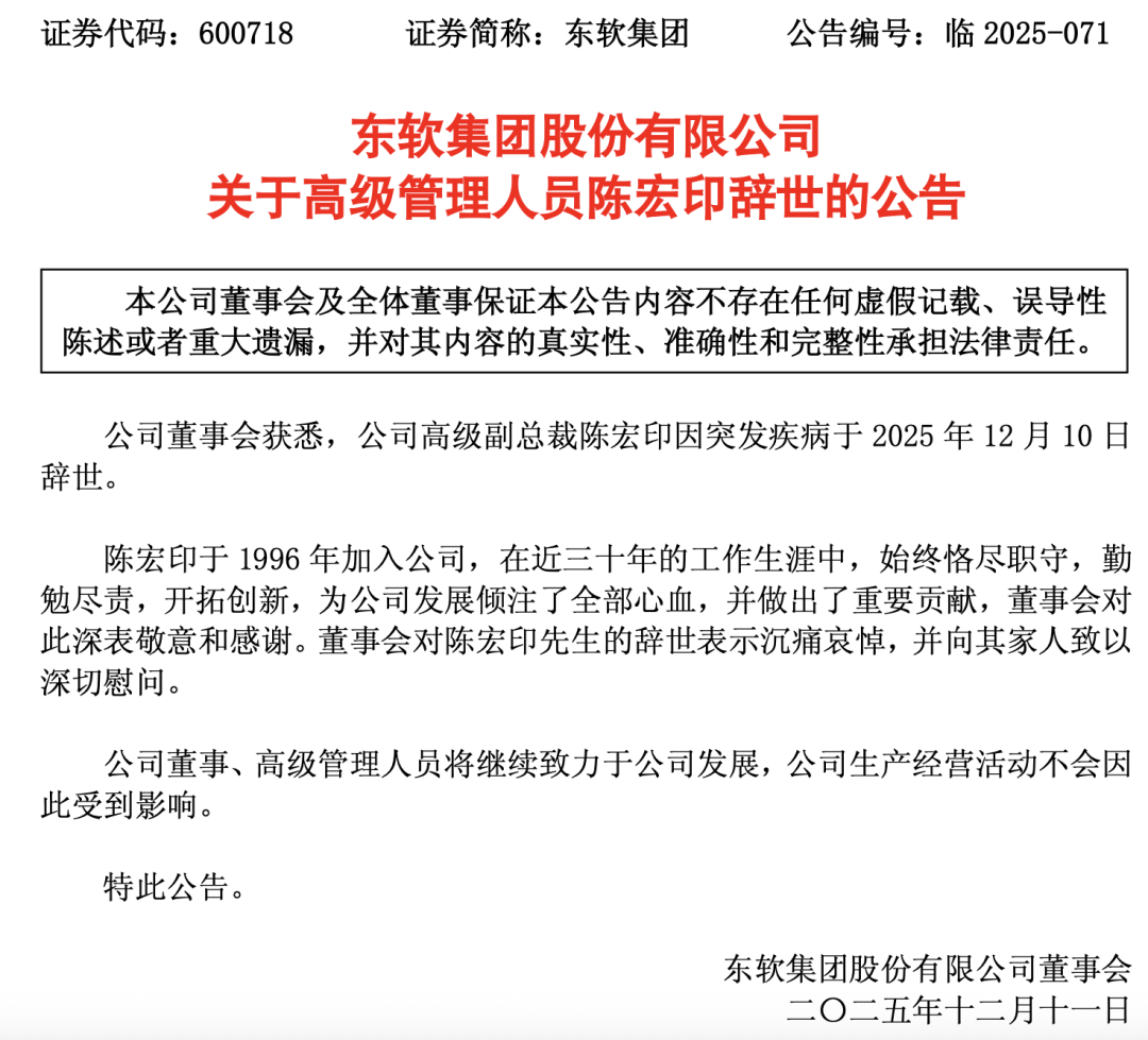 12月11日晚间,东软集团发布公告称,公司董事会获悉,公司高级副总裁陈宏印因突发疾病于2025年12月10日辞世。