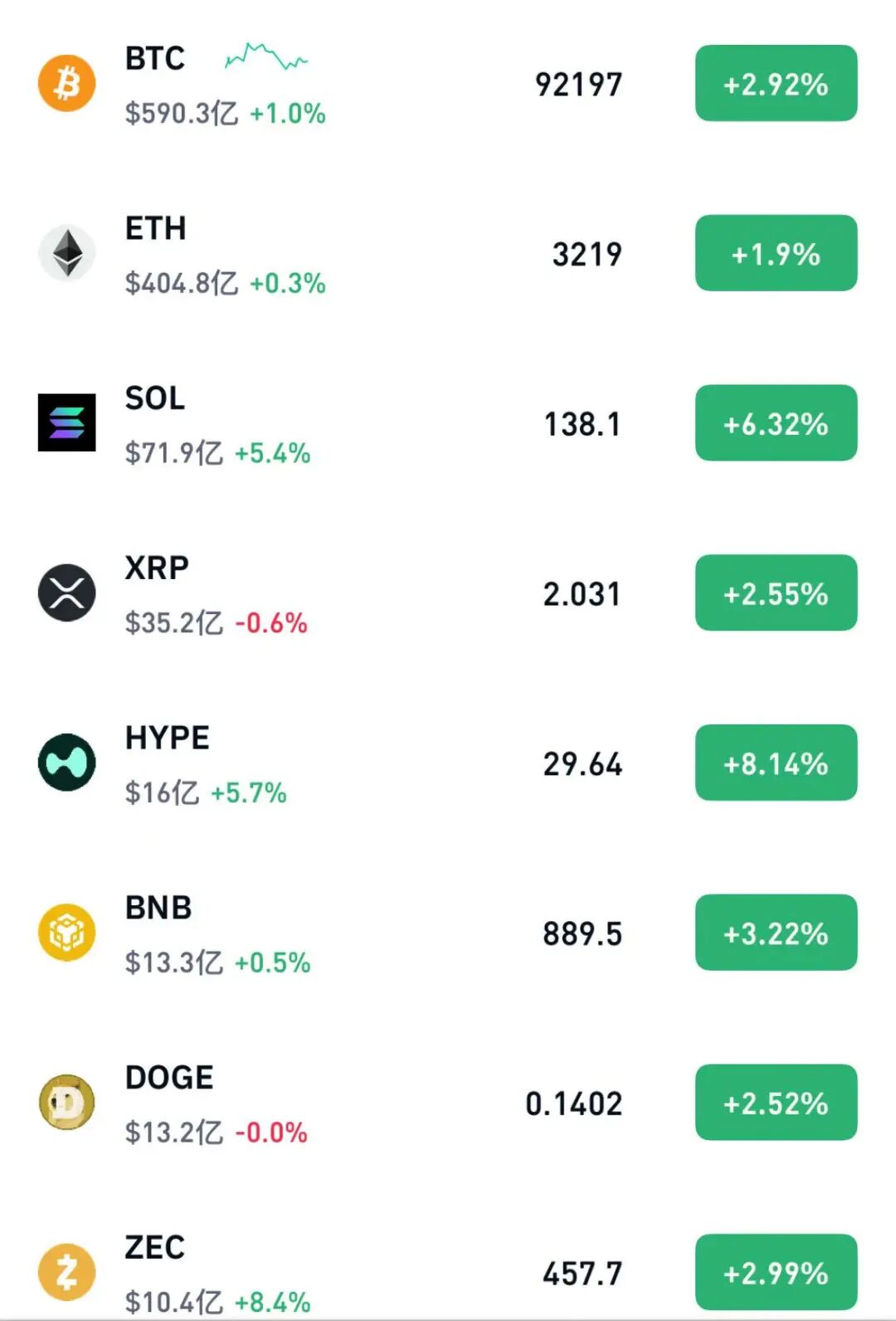 加密货币集体拉升,比特币重回92000美元关口上方。