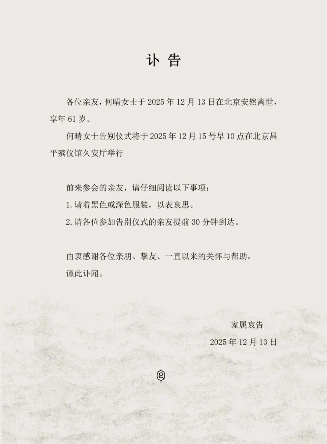 12月13日,一份家属发布讣告显示,著名演员何晴在北京安然离世,享年61岁。告别仪式将于2025年12月15号早10点在北京昌平殡仪馆久安厅举行。