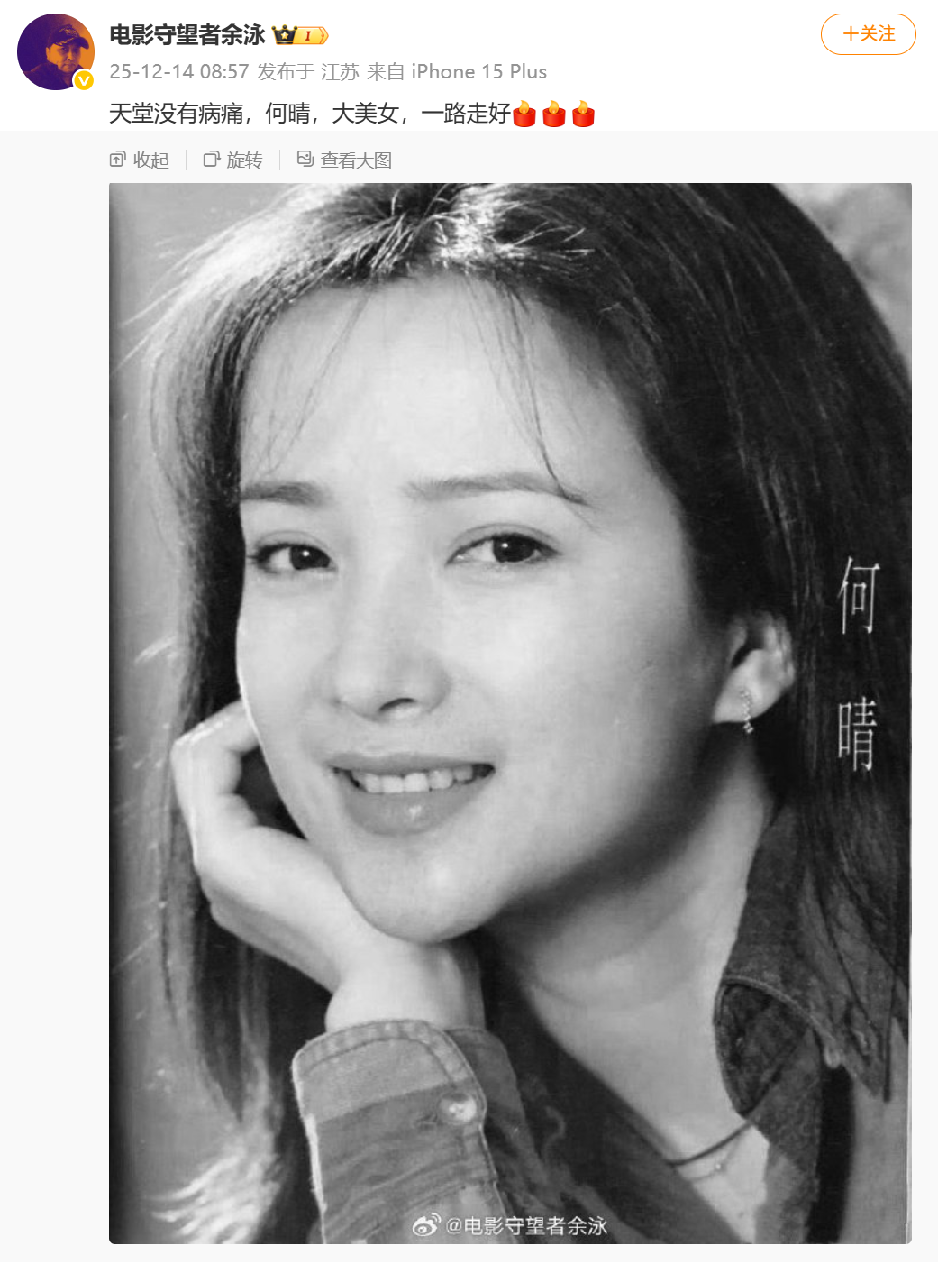 “电影守望者余泳”向记者证实了这一消息,他于社交平台发布何晴的黑白肖像照,并配文“天堂没有病痛,何晴,大美女,一路走好”,引发网友与演艺圈人士的集体缅怀。余泳透露,何晴生病后一直希望低调,让大家永远记住她美好的形象。