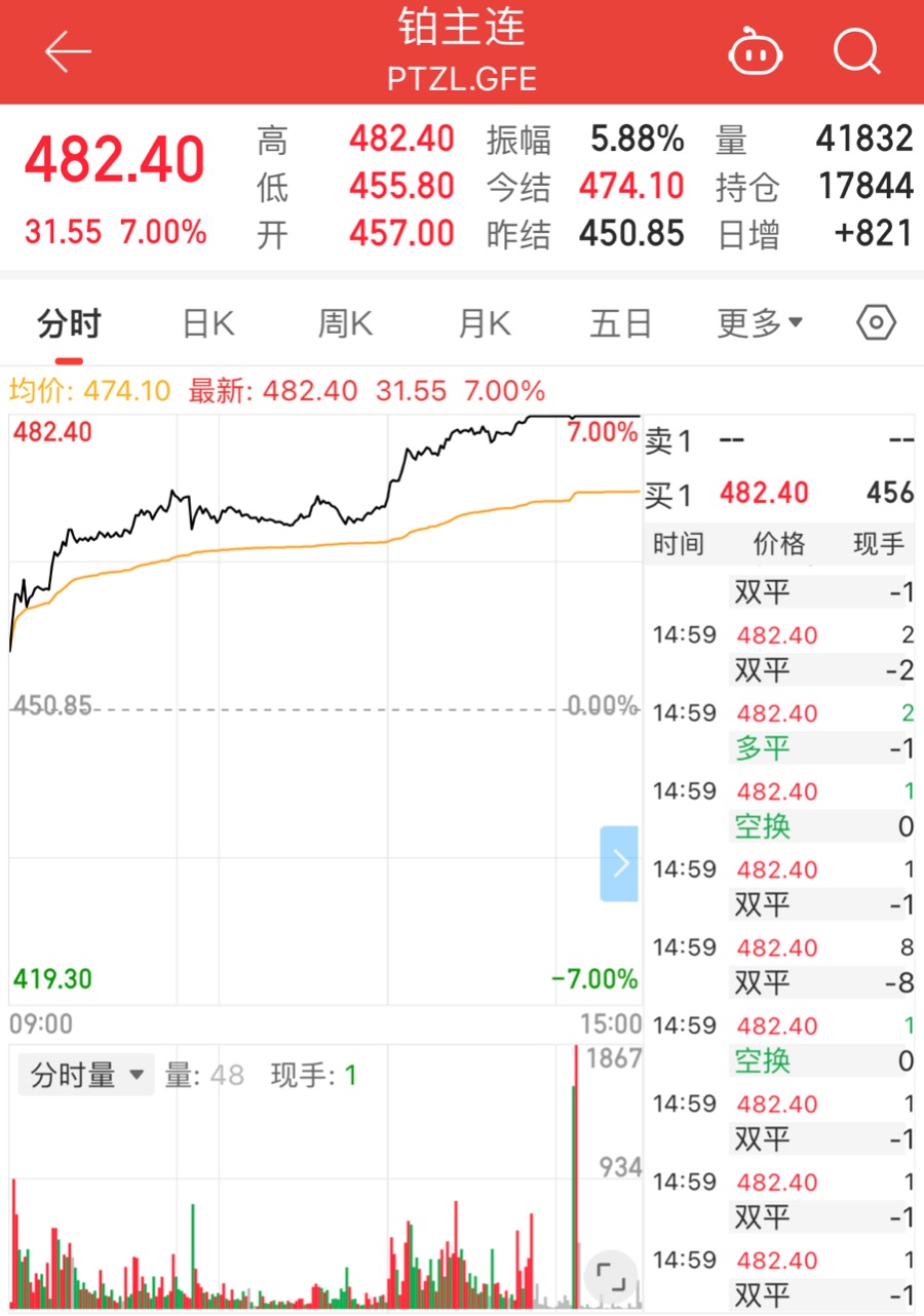 12月15日,国内商品期货市场迎来重磅异动,铂期货主力合约盘中强势上攻,日内触及涨停板,收报482.4元/克,单日涨幅高达7%,远超今日沪金主连1.92%的涨幅,这也是该品种自11月27日在广州期货交易所上市以来的首次涨停。
