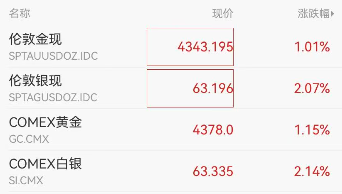 黄金白银强势上涨,截至14:55,现货黄金日内涨超1%,向上触及4343美元/盎司,现货白银涨超2%。