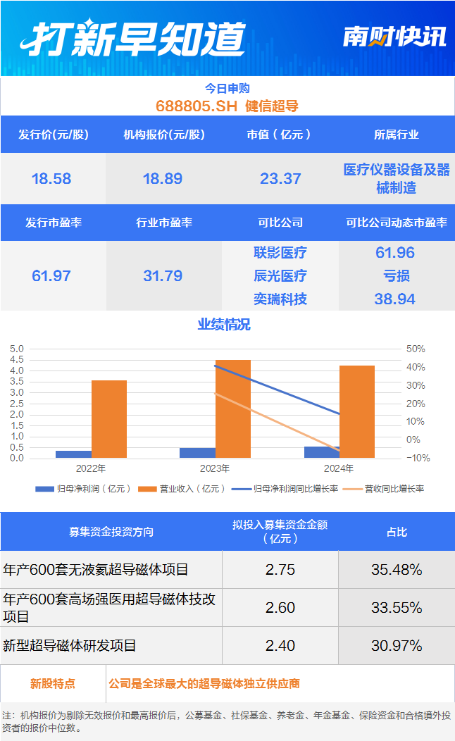 12月15日,可申购科创板的健信超导(688805.SH)。该公司成立于2013年12月11日,主要从事医用磁共振成像(MRI)设备核心部件的研发、生产和销售,主要产品包括超导磁体、永磁体和梯度线圈,这三大类部件占MRI设备核心部件成本的比例在50%左右。