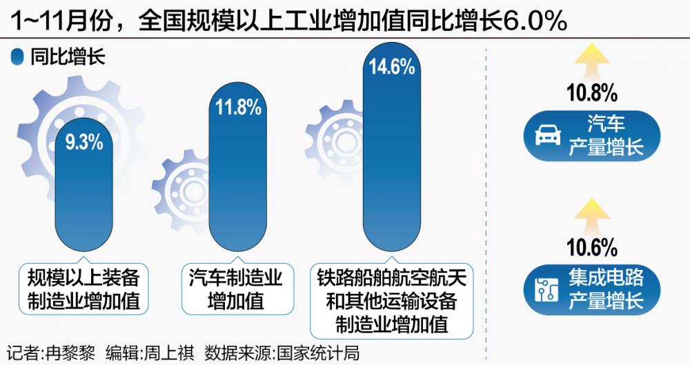 总体来看,1—11月份,规模以上装备制造业增加值同比增长9.3%,占全部规模以上工业的比重达到36.4%,其中汽车制造业、铁路船舶航空航天和其他运输设备制造业增加值分别增长11.8%和14.6%。