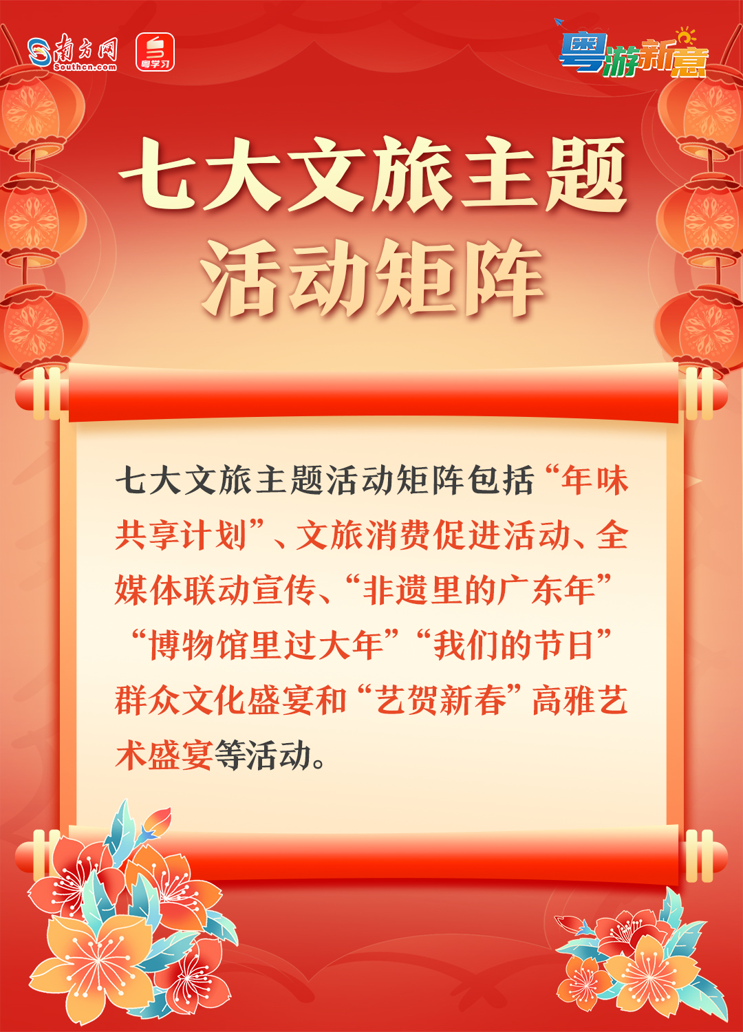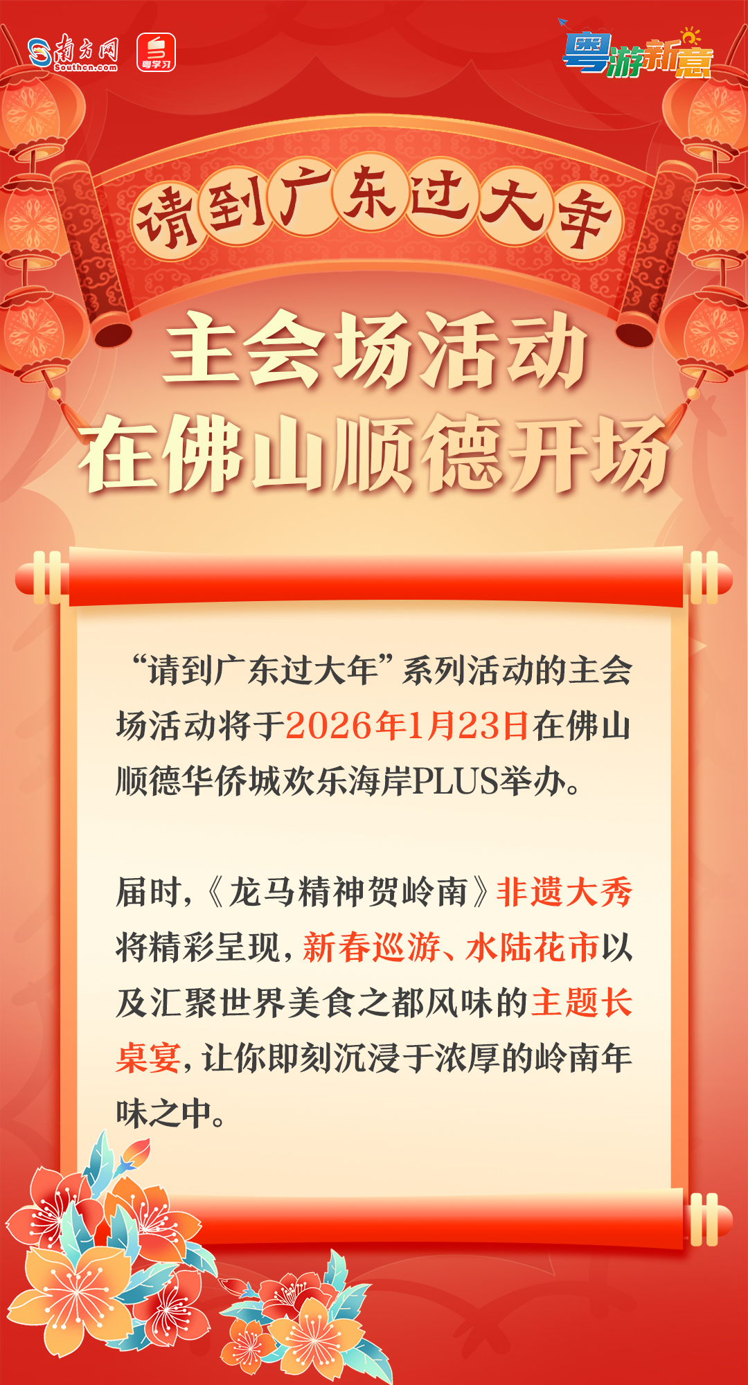 12月15日,广东省文化和旅游厅主办的“请到广东过大年”系列文旅主题活动拉开序幕,活动聚焦春节探亲游、欢聚游市场,主打民俗、文化和年货节主题,计划于2026年1月至3月举办。这个有韵味、有潮流、有温度、有惊喜的岭南新春佳节不能错过,一起来共赴一个富有人间烟火和岭南风华的欢乐中国年。活动亮点抢先看↓