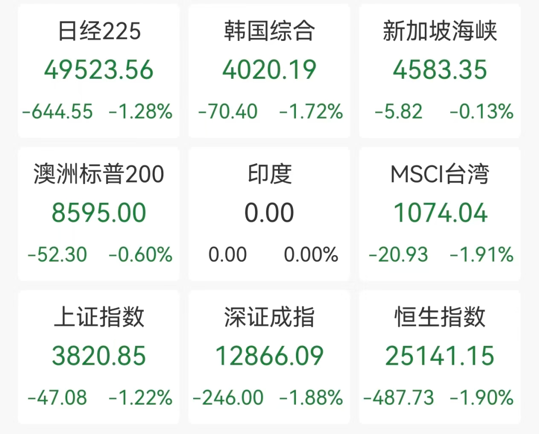 12月16日早盘,亚太主要股指全线下跌,截至午盘,日经225指数、韩国综合指数均跌超1%,A股三大指数与港股恒生指数集体飘绿,富时中国A50指数期货亦跌超1%。贵金属期货多数下挫,加密货币持续大跌。