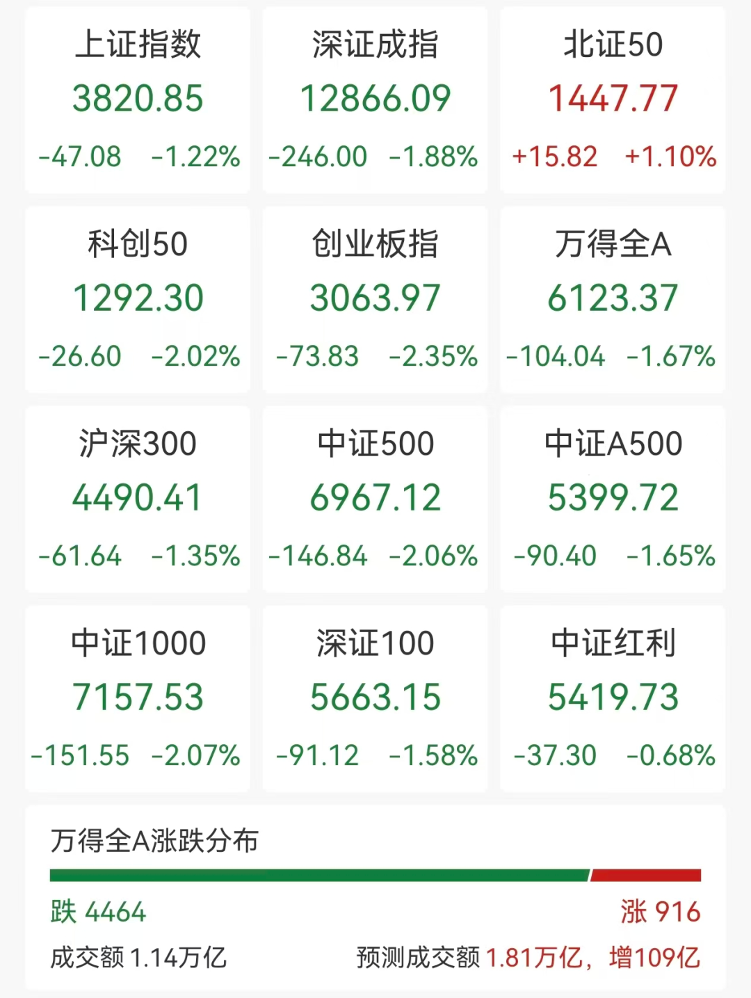具体来看,A股早盘震荡调整,沪指、深成指跌超1%,创业板指跌超2%,北证50逆势涨超1%。全市场4464只个股下跌。