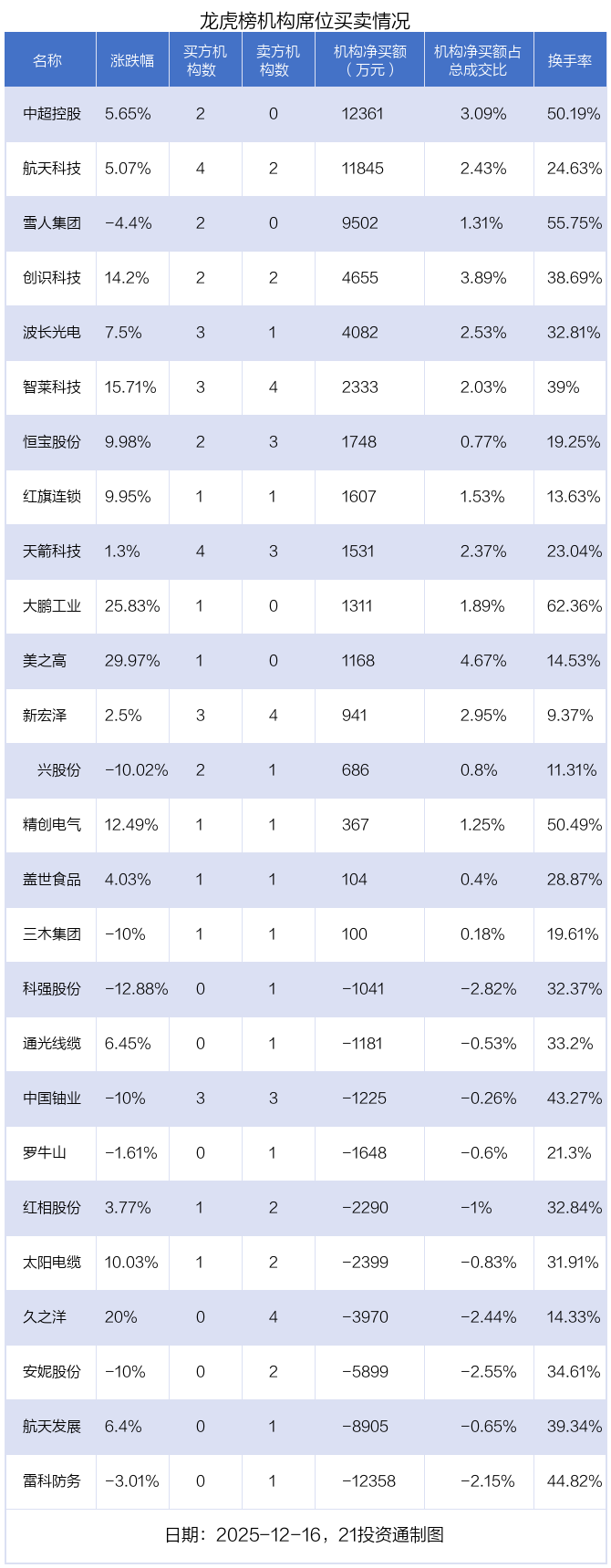 12月16日,26只个股龙虎榜出现了机构的身影,机构合计净买入1.34亿元。具体来看,机构净买入16股,净卖出10股。